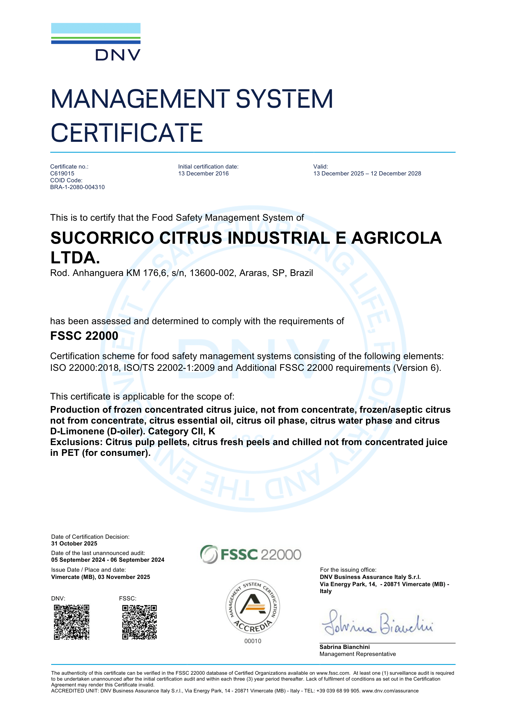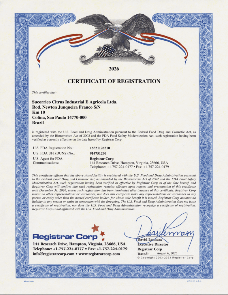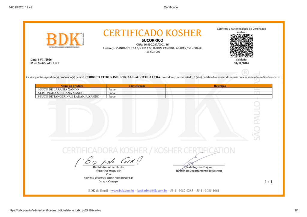 O Sistema de Gestão Integrado da Sucorrico é continuamente melhorado para atender todas as demandas dos clientes e da própria empresa. Principalmente focando em Qualidade e Segurança Alimentar, seguimos todos os procedimentos de Boas Práticas de Fabricação (BPF) e somos certificados pela FSSC 22000 ( DNV ), SGF, FSA/SAI, Smeta, FDA, Halal e Kosher.