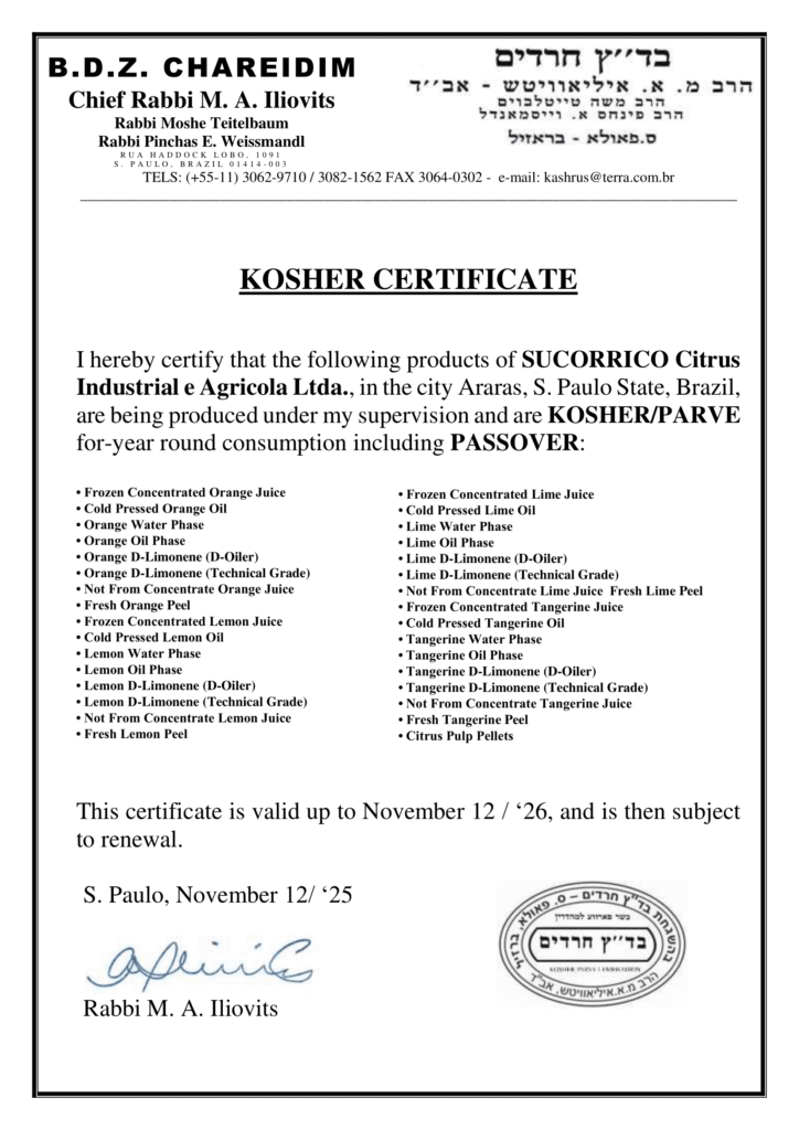 Obtained from natural juice of ripe and healthy oranges (Citrus sinensis), extracted, pasteurized, and concentrated through a fully mechanized process, preserved exclusively by physical means.